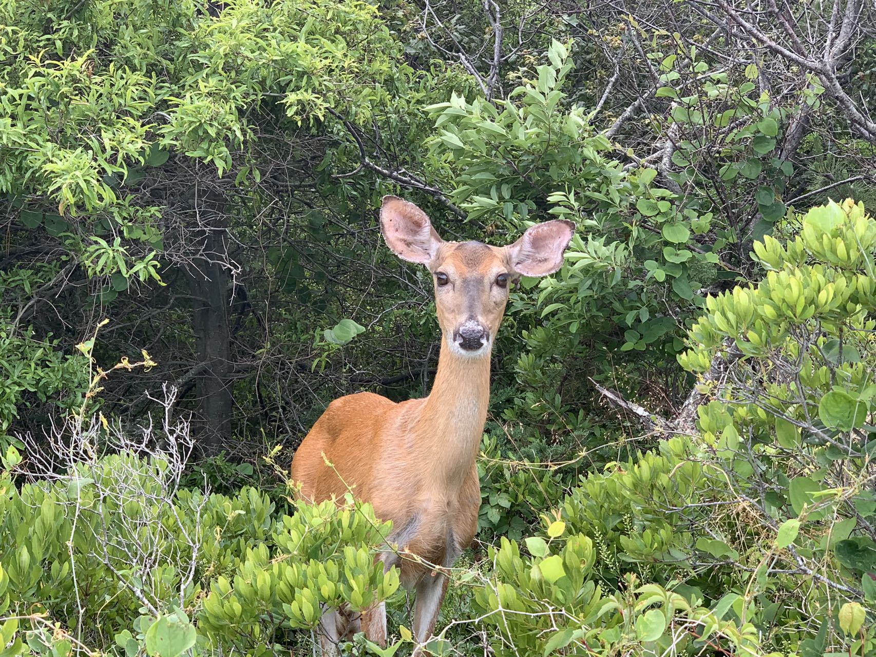 幾只小鹿在路邊的樹叢中悠閑地漫步,一點也不怕人,睜著美麗的大眼睛,似乎已經熟悉了人們的觀賞。