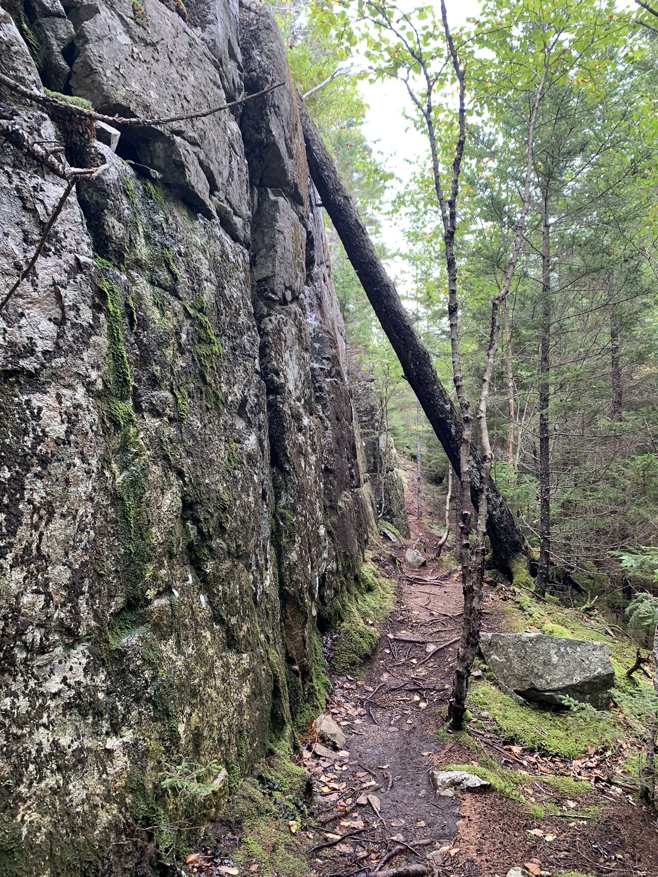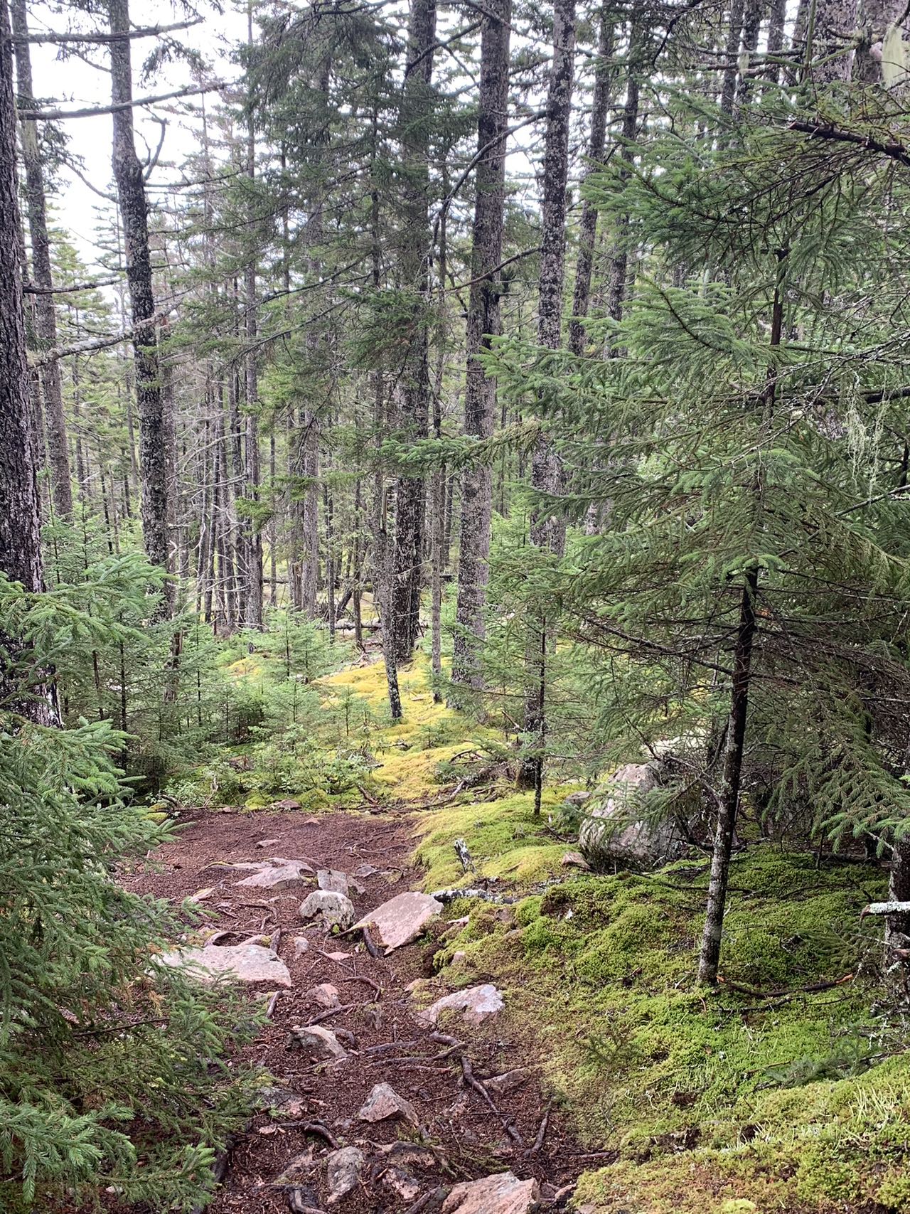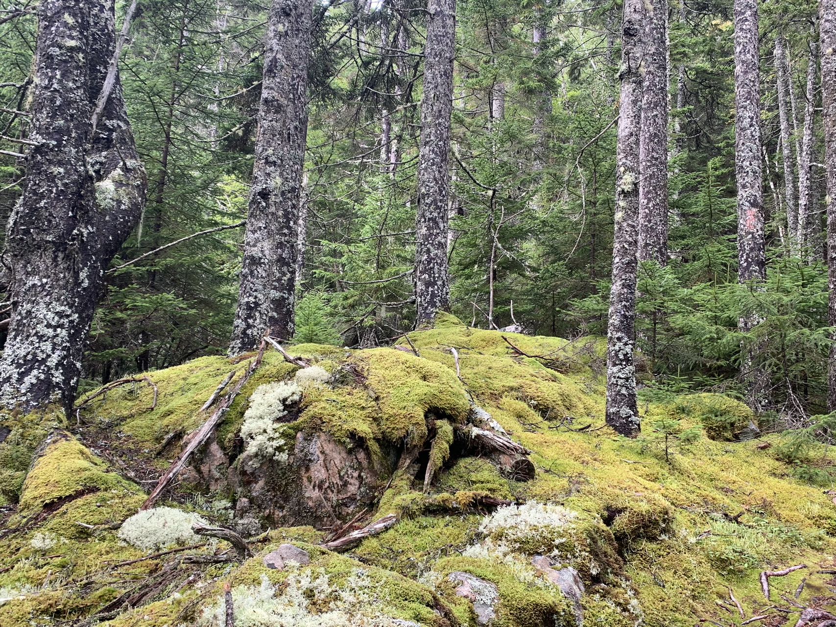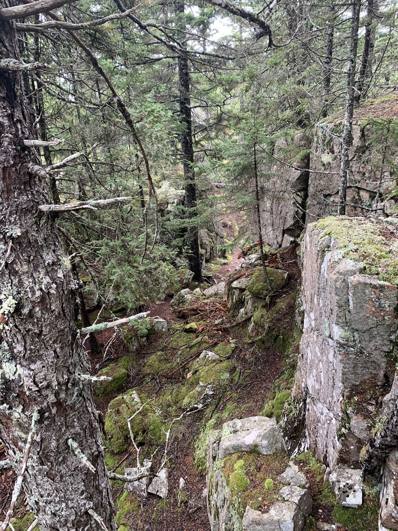 一路上有铺满松针的坡道、有大片光滑岩石的天然大道、有陡峭的石崖、需要手脚并用攀爬 、有木板搭就的独木桥、有溪流、有森林、有长满青苔的湿地、如入无人之地的原始森林。山峰层峦起伏。森林中,巨大的花岗岩,茂密的云杉林连绵无边。