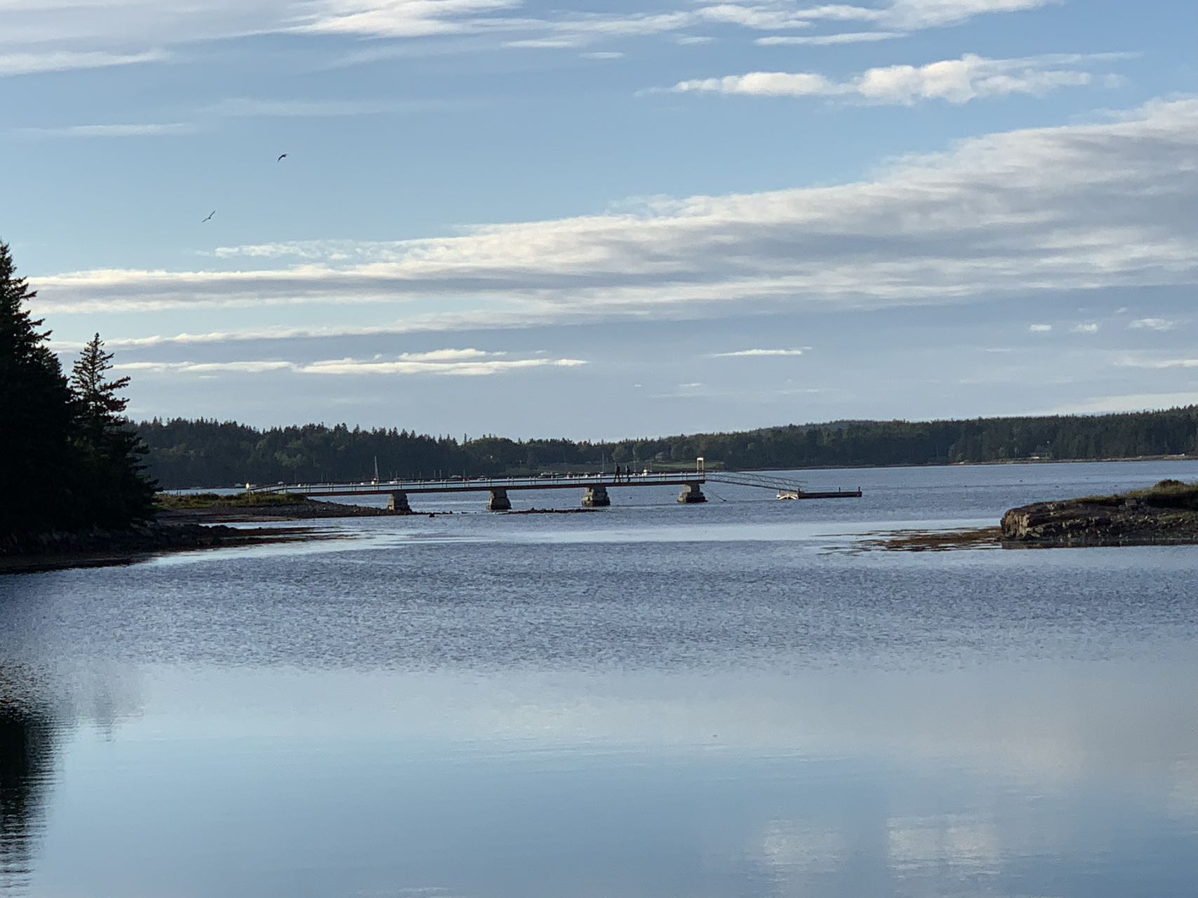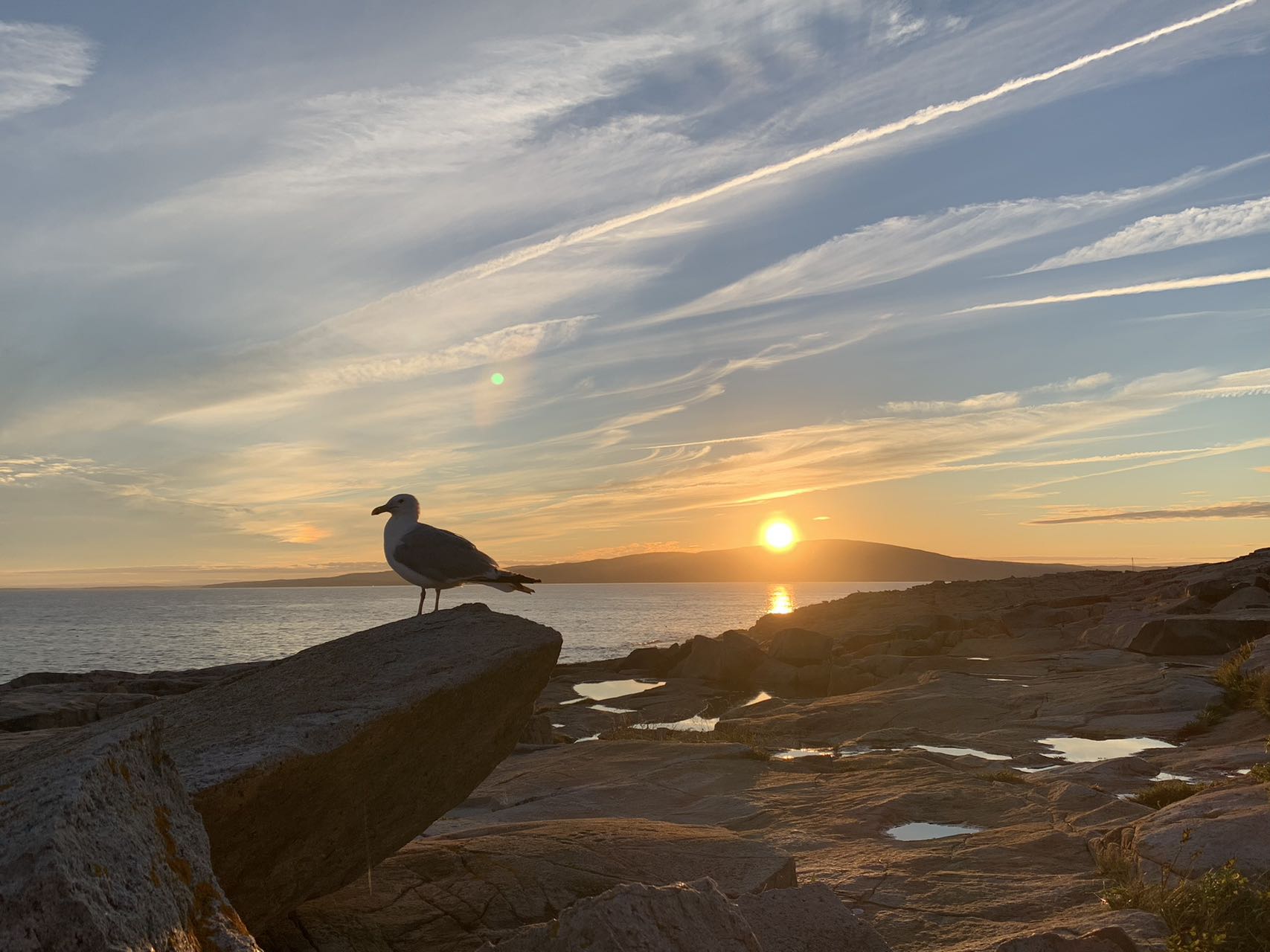 这是一片开阔的岩石滩,一直延伸到大海里,约一百公尺远,这里可以看到许多海湾跟礁岩岛,龙虾船、飞翔的海鸥、还可以眺望到我们昨天游过的荒山岛(Mount Desert Island)。