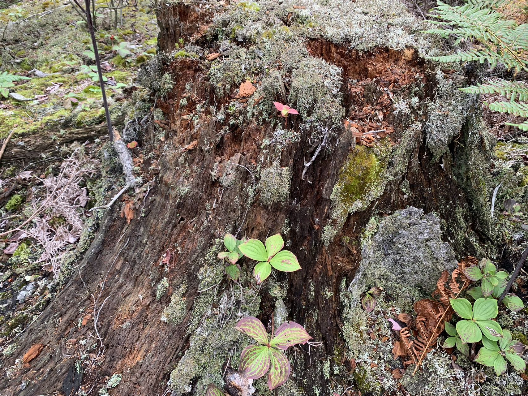 枯死的树桩上生出新鲜的枝丫,这应该是枯木逢春了!倒下的树杆上,留下了一堆松鼠吃过的松子壳。