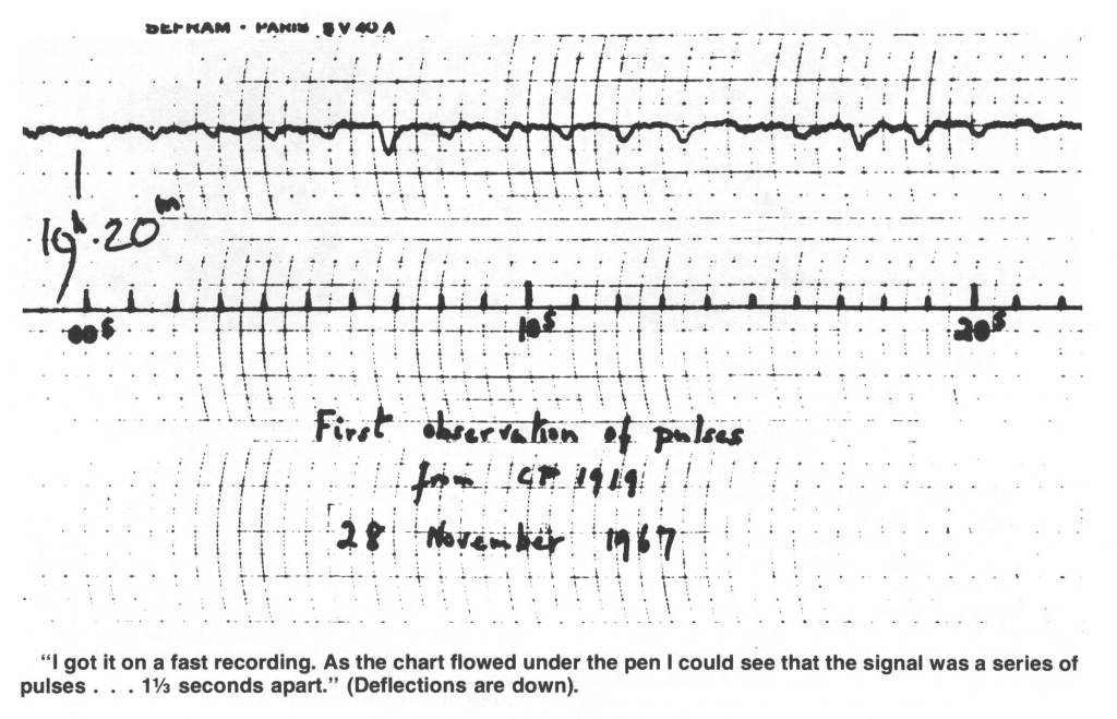 包括贝尔在内的五六个学生花了两年时间才完成这个工程。1967年夏天,她整天把头埋在没完没了的记录纸中,察看纸上记录的那些晾衣绳一般的天线上接收到的电波,辨认着来自类星体的信号。几个星期后,她突然注意到一个不寻常:有一连串的电脉冲非常有规律地每隔1.33秒出现。她连续跟踪了几天,发现它总是在天线阵对着天空同一方位时出现。很快,她们确定了该信号来自太阳系之外,不是地球人的作为。这么规律、高频的信号在天文观测中还从来没有过先例,最可能的……莫非是有外星人在给地球发电报?