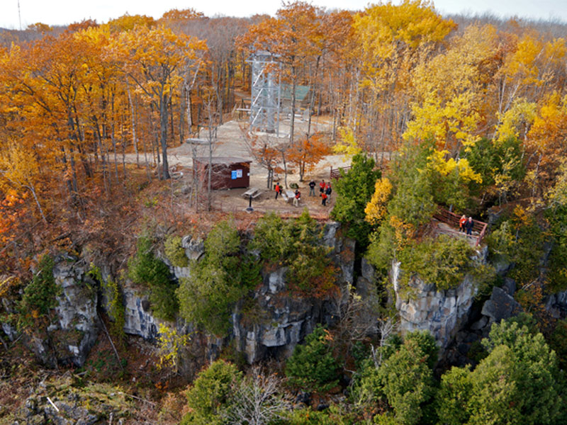 步道尽头,又有千万年前形成的峡谷奇罅凹陷进去,扶梯小心翼翼地慢慢下去探幽,周围俱是布满了青苔的湿岩,和倒坍下来的巨石堆积起来的崎岖曲径,有的地方险过蜀道之难。在谷底仰视青空,有时简直就如同一线天;又回首来途,有时狭窄得侧身才能通过,疑似无路一样。这处景点亦像国内的景区似的,因着各个特点起了些美名来发人遐想、便于记忆,像什么点将台、悬挂石、酋长头像、讲坛等。看过之后方明了,哪里有什么洞穴,就是个九曲十八回、高低叠次的阴沟深壑、裂缝罅漏而已,所以此名有点不副实,给我的感觉类似当年登庐山访仙人洞,一瞧亦非如所想的那样,原来只是文人骚客的意淫描述,然而这在无甚险峰喀斯特地貌的安大略还是蛮引人入胜的。