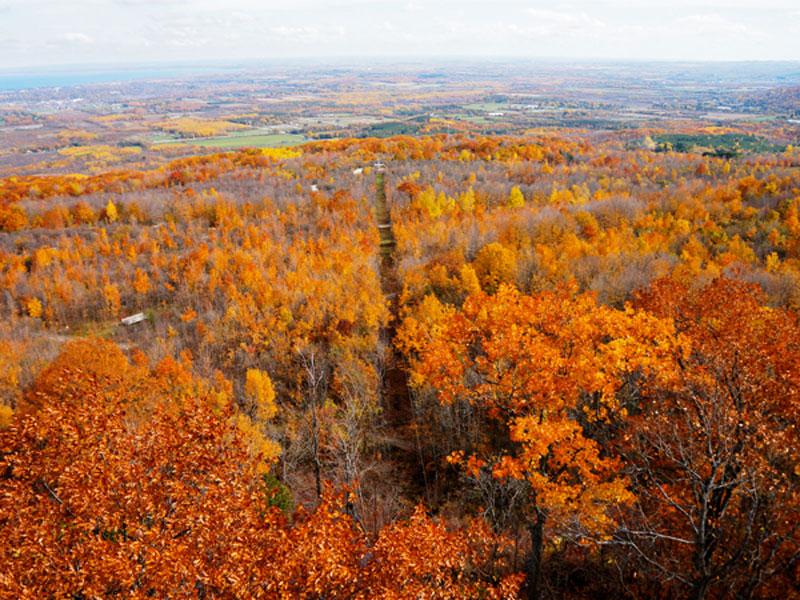 攀缘着回到崖顶,徘徊在不同的观景点,通过林木的豁口望出去,近前的下坡树头杂色相间,远处的红彤彤成了一片。更远处是蔚蓝色的休伦湖佐治湾和岛上的白色灯塔,依稀可见镶嵌银边般的Wasaga长滩,好一幅俊美的印象派油画,上主绘制的大自然美图,让世人居住其中、四季岁月观看,实在荡气回肠,我大发“江山如此多娇”慨叹。记得今夏我们游览花瓶岛时,途经的布鲁斯半岛同地带是披着绿色的绒衣,现在“变脸”改穿橙赭色外套,想到不日冬天降临,就又换成银装素裹、雪袍加身,除了上帝的大手笔和化妆,又有谁能如此随意地给换装、调色绘出这天幅季节图呢?