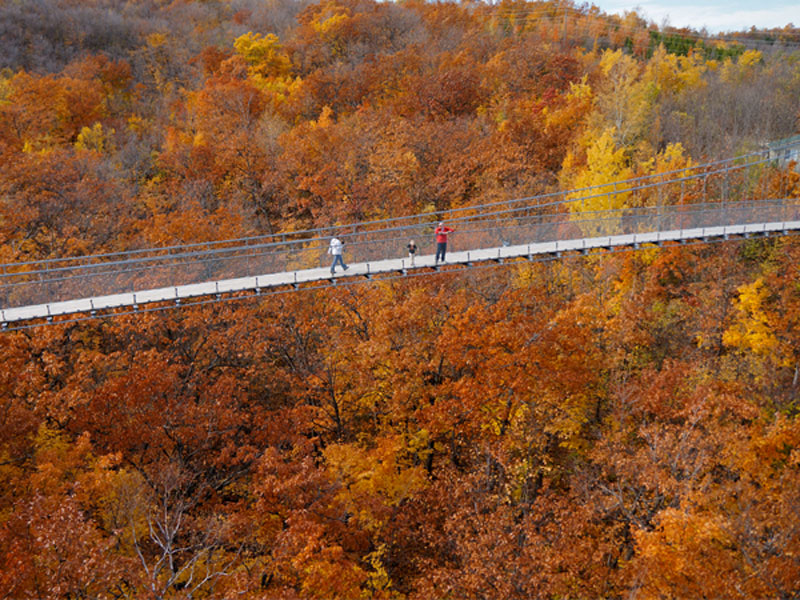 观赏的另一个高潮,是我们步上了悬空吊桥。这座钢丝绳索和木板铺就的人行桥梁,长126米,宽3米,距涧底25米,比远处的休伦湖面高三百多米,飞架在峡谷之上,好似琥珀簪山束腰的汉白玉带,又似一匹白练当空颤舞。行走其上,晃晃悠悠的,惬意不已。桥头俩钢塔高12米,在三季漫山的黛色中呈“万绿丛中一线白”的艺术果效,眼下则被红叶簇拥相随着,在圯上凭栏远眺,视野开阔,极目天舒。向山下俯瞰,越过菜花状的葱茏粉彩树头,可更清晰广阔地一览靛蓝湖色与Collingwood小城风光,大地美如丹青,给人以“全国山河一片红”、“万类霜天竞自由”印象;往山上举目,如屏似画的锦树绣林直接天际的绵云苍穹,予人以“千山红遍、层林尽染”之感,教我们心灵震撼,肺腑舒畅。