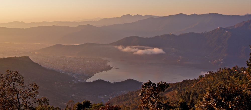 随着拂晓来临,观景台右首渐渐呈现出群山环绕清云薄雾中的博卡拉和费瓦湖。