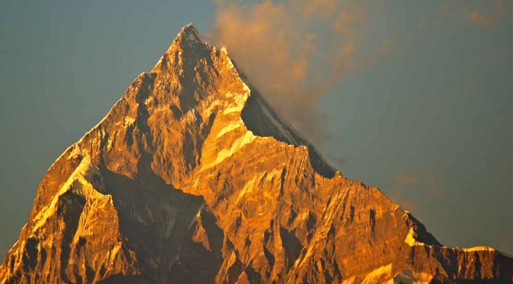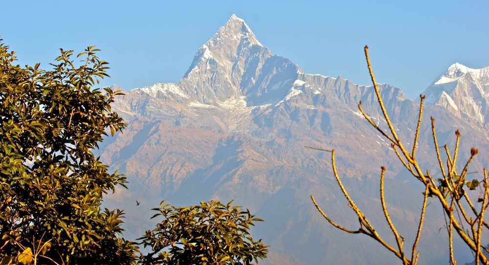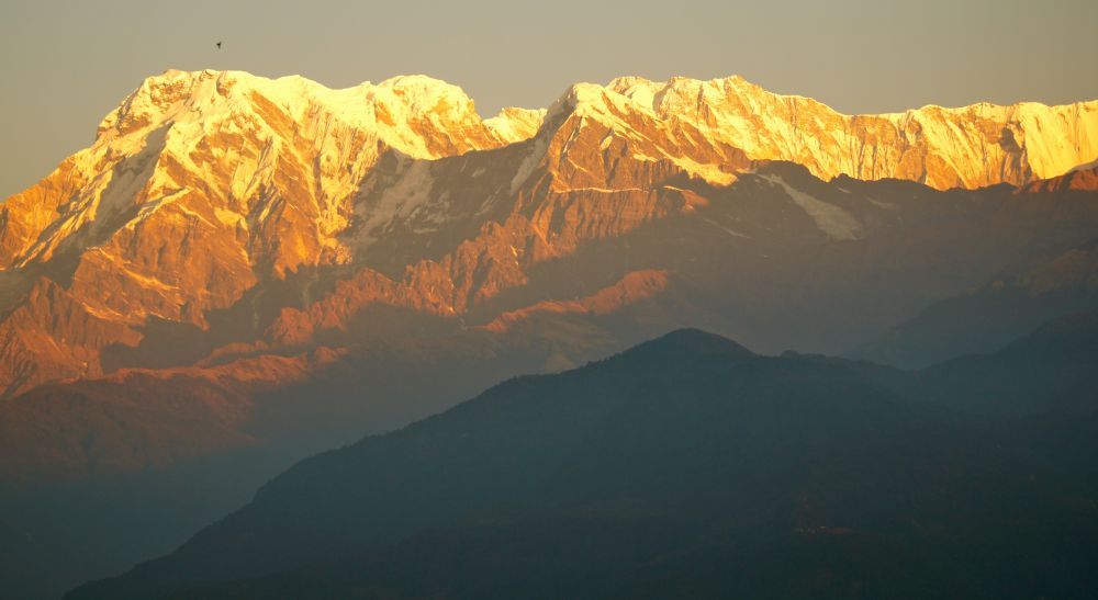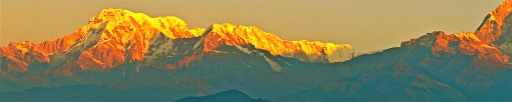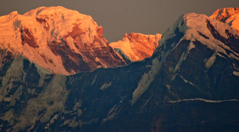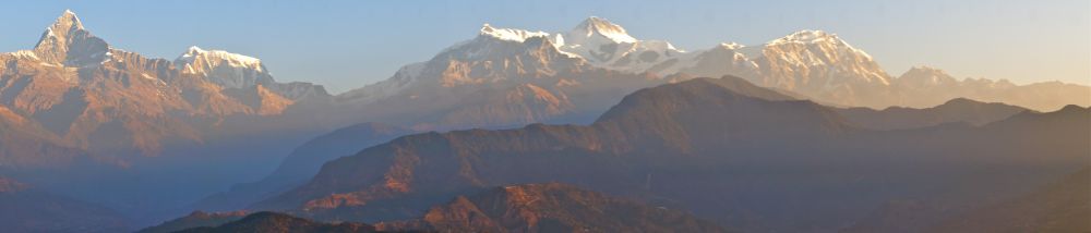 左首也渐可观赏到喜马拉雅山脉全景轮廓:从西边的道拉吉里峰(8167米)到金字塔形的鱼尾峰(6997米),再到东边的安纳布尔纳峰二号峰(7937米)。。。它们在清晨的岚气缭绕中层峦叠嶂,连绵不绝。