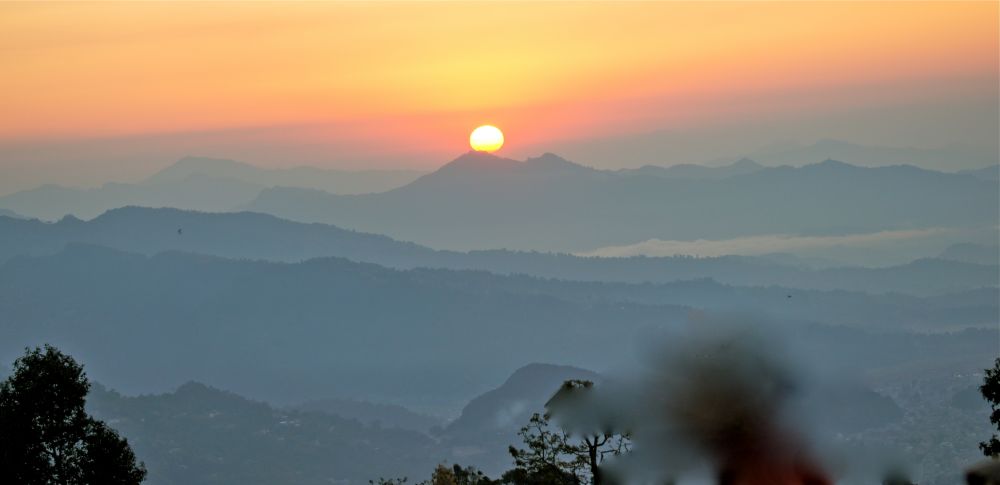 第二天绝早约五时许, 小伙子果然如约把我们带到了当地的最佳日出观赏位置-市区北面五公里的一处小山头沙拉阔(SARANGKOT)。这里海拔约一千五百米, 设有不同地点的观景台。我们停好车,随着一群群黑乎乎的游人们在黎明前的夜色中爬了一会儿山,然后进入一处象是农家的建筑物,攀上其屋顶,方知这里其实是 一处设备现代的观景点-已有约摸百来人静坐在折椅上等待着日出。只记得人们可以下楼喝热饮,吃早餐,还有御寒的毛毯可取用。可我根本记不得那天早上自己的 吃喝了,因为即将而至的景色彻彻底底的震撼了我!