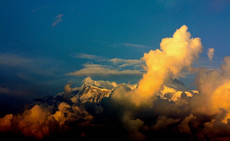 又用长镜头照下了道拉吉里峰,鱼尾峰等山峰的“金裹银顶”倩影。