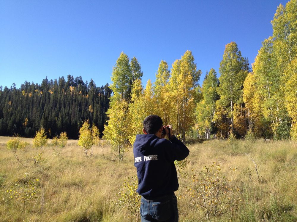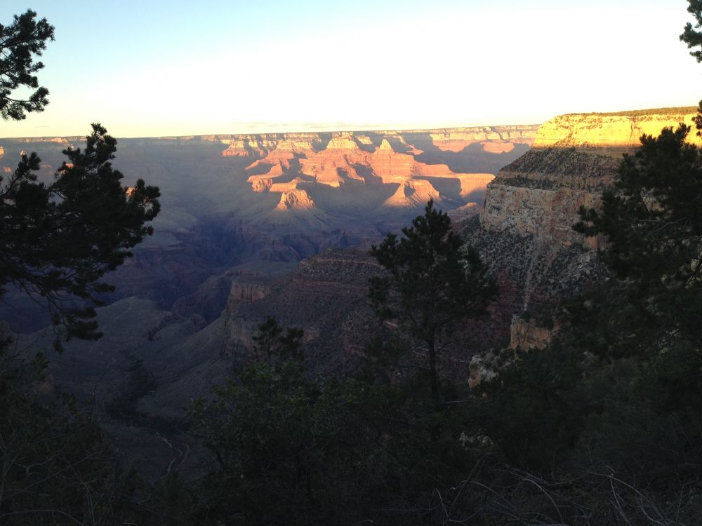 经过两天的长途奔波, 穿过金秋白杨树覆盖的Kaibab国家森林, 我们在傍晚时分抵达大峡谷的北岸。太阳的余辉照在大峡谷陡峭的绝壁上。我们不等车停稳,就疾步奔向大峡谷边缘,看着夕阳浸染,势磅礴的峡谷,我们终于看到了她的真面目。夕阳的余晖很快从大峡谷退去,黑夜马上覆盖了深不可测的峡谷。只见零零星星几盏头灯在下方密林中闪烁,那一定是勇敢的徒步者正在探索大峡谷的奥秘。明天一早我们也要追随他们的脚步,深入谷底。