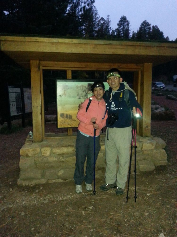 第二天早上我们俩兴奋的四点多就醒了, 又一次仔细检查了我们的每样装备,就在夜色朦胧中出发了。六点一刻我们已经坐车来到从North Kaibab下峡谷的道路起点, 正式开始了我们徒步穿越大峡谷的征程。大峡谷的北岸海拔2512米(8241英尺),我们今天计划走到谷底的Phantom Ranch, 里程22.5公里(14英里)。 这时天已经开始放亮,天上竟然开始飘起了雪花。天上的乌云在逐渐加重,我心里暗暗祷告,千万不要下起大雨啊。糟糕的是这时发现我们准备得雨衣竟然忘记带了, 也只有听天由命了。和我们同时出发的人早已匆匆奔向谷底,我们是走走停停,尽情感受着大峡谷清晨的幽静。大峡谷显得异常安静,只有我们两人漫步在空无一人 的幽谷之中。