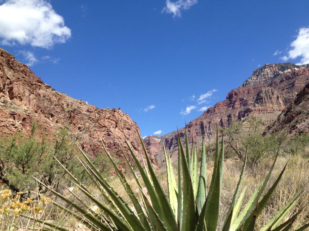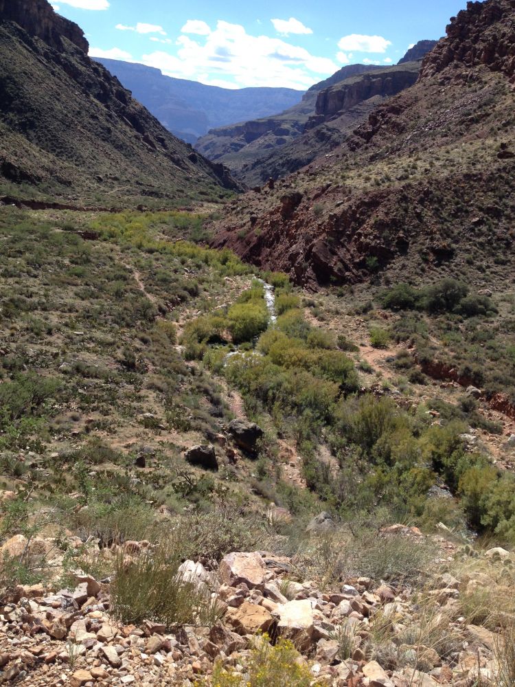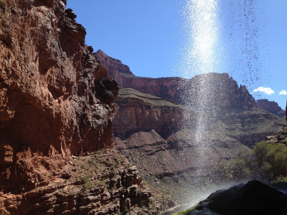 过了Cottonwood野营地, 地势平坦了许多,但植被也越来越少。北岸茂密的森林不见了,取而代之的是矮矮的剑麻和仙人掌。气温也逐渐升高。大峡谷岸上和谷底温差很大,一般情况下相差近十五度。夏天的时候谷底温度可以高达五十度。四月初和九月底的温度相对温和一些, 今天晚上谷底也有二十多度。沿着光秃秃的道路慢慢前行,周围没有一丝遮挡,完全暴露在大峡谷正午的阳光下,我们庆幸我们不是在七月份完成我们的徒步之旅,否则的话我一定就牺牲在这里了。正当我们走的精疲力尽,口干舌燥的时候,我们来到通往彩虹瀑布(Ribbon Fall)的岔口。正当我们犹豫不决是否多走三四公里去看瀑布,一对年轻夫妇站在岔口处对彩虹瀑布大加赞赏, 我们也就义无反顾的踏上通往瀑布的小路。在彩虹瀑布,我们却有意外的惊喜,感觉走入了不一样的洞天。穿过竹林,趟过小溪,一条细细的瀑布从天而降。感觉疲劳顿消。