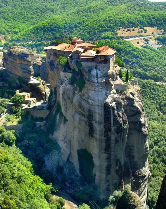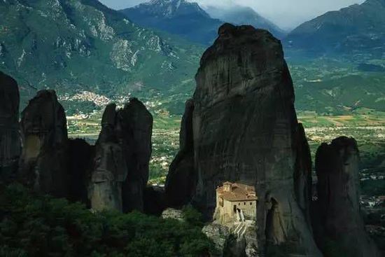 希腊中部地区有一派奇特的景观,数十座20~400米高低不等的柱形垂直岩石群拔地而起,建造在陡峭岩石顶上的24座修道院仿佛悬浮在空中。