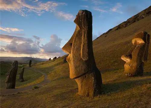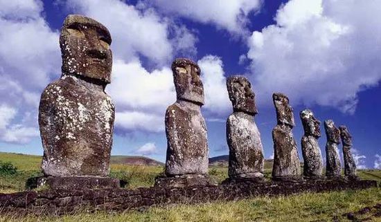 复活节岛上最著名的是巨大的石雕像,已发现的约有1000尊。这些巨大的石雕像大多在海边,有的竖立在草丛中,有的倒在地面上,有的竖在祭坛上。