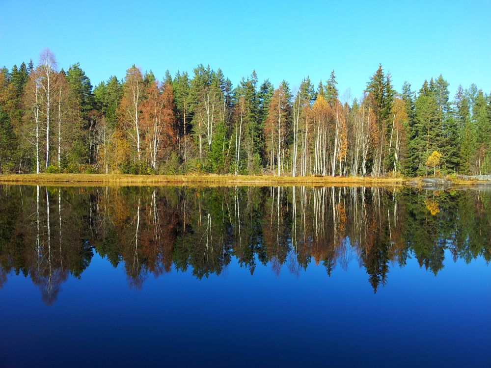 沿途的湖水更是万般迷人。蓝天下,一排排雪白的桦树笔挺地矗立在湖边,格外醒目。湖水又把天空的碧蓝加入一份深蓝色调。纹丝不动地水面则将湖边树林忠实地反映在深蓝的水天之中。一泊静水把眼前的景色一分为二,上下对应,各具妩媚。水中的景致被那高贵的深蓝色调覆盖,呈现出一派神圣的宁静,把大自然的深邃表现到了极致;水面上方的秋景则是让橙黄柠黄的秋叶和洁白的桦树皮掩映得亮丽而缤纷妩媚。伫立在湖边面对寂静神秘的晚秋画面,让时间自由地从身边飞逝,让一泊静水把心绪理平,再一次臣服在大自然的杰作之前,再度体验“存在”的新鲜涵义。
