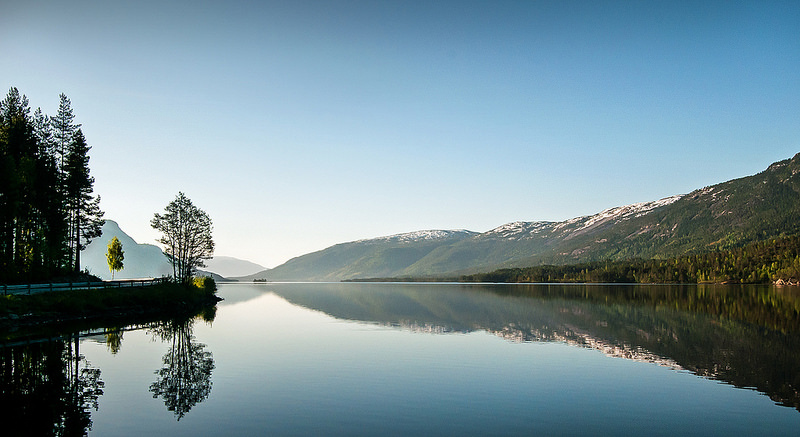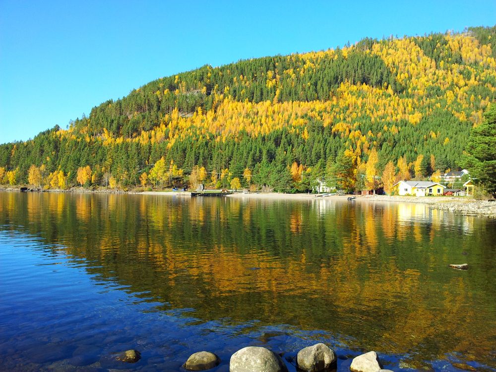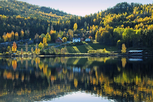 山中景色最奇特。挪威植被以松柏为主,桦树杨树本为小树种。但是这里的桦树却是相当多。晚秋季节,橙黄色的桦树叶和柠檬黄的杨树叶不经意地在远山林中划上大大小小形状各异的斑块。在斜阳的映照下,给人留下温暖悦目的色彩组合。而道路两边成排的桦树和路面上的落叶则把整个公路妆扮成为一条狭长的明亮的金色隧道。行车其间,仿佛那是一条能引我们进入世外桃源童话世界的通道,令人兴奋不已。
