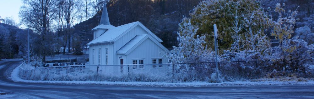 这是一条东西走向的山谷,小镇夹在南北两座山中间。高达1500米的南山(Gaustatoppen,海拔1880米)挡住了正午的阳光,使得小镇只在夏季有短时日照。虽时值晚秋,山谷里则是一片冬日气氛。街上无一行人,只有公路上的汽车匆匆地穿过小城。在暗蓝色的山影中,半空中清晰可见一层淡淡的深蓝云雾,那是昨晚各家烧壁炉时放出的烟。时近中午,仍可见几家烟囱里冒出的数缕蓝烟。烟雾慢慢地离开烟囱,宛如幽灵一样扶摇上升弥漫在小镇上空。这一切把小镇染成一个蓝色的世界。小河流水蒸腾着将白雾散落房屋树木上,每座房子都变成童话世界里的雪白楼宇,所有的树木都成为雾凇。然而,在蓝色的笼罩下,映入眼帘的是白色楼宇和雾凇渗出的惨白阴森的深蓝冷光。虽是晴日,但小镇却显得毫无生气,给人以人间地狱的联想。令人寒栗沮丧。