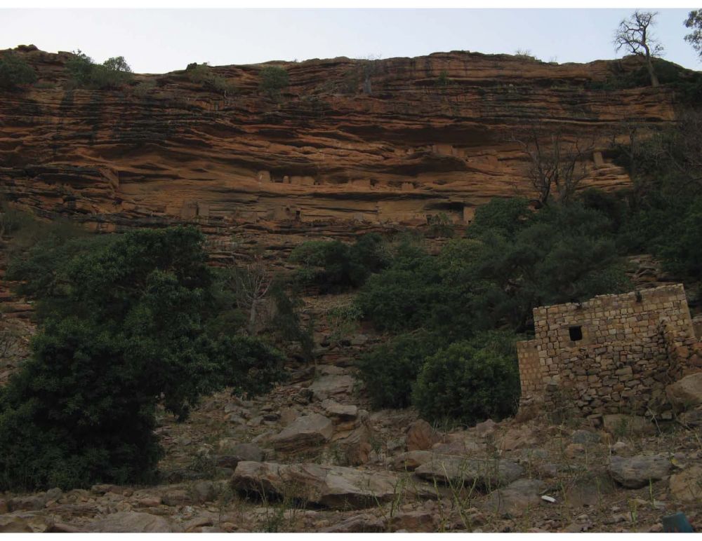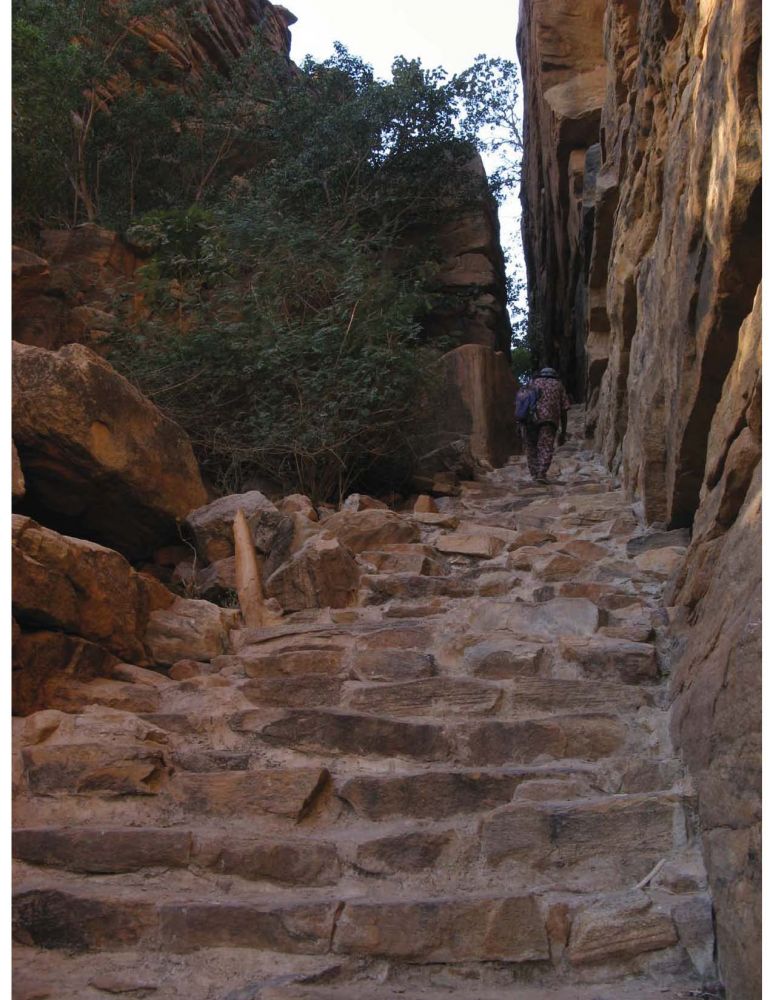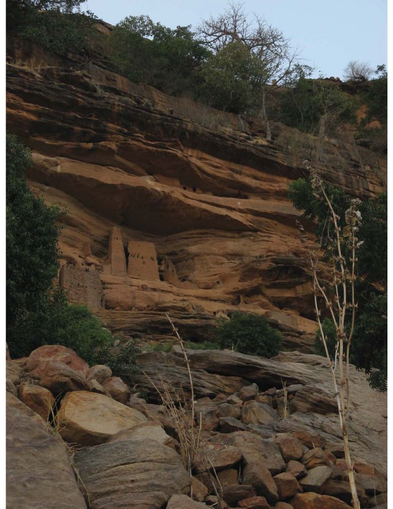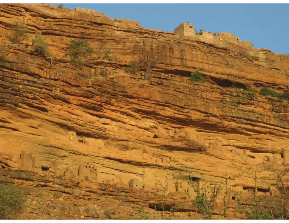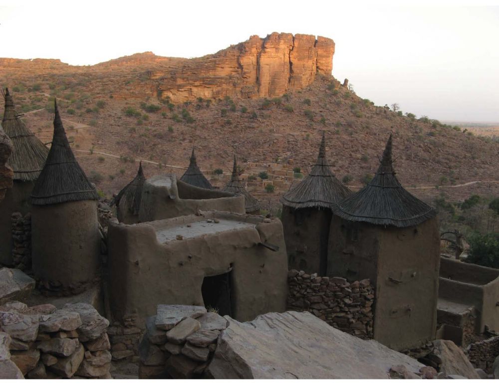 带着这些遗憾,经Douentza折回莫迪附近的Sevare。掉头向东南,直奔三 甲之首的陡岗(Dogon)。这是一条几十公里长的悬崖,上下遍布历史悠久的大小村落。位列某些“一辈子必须走一趟”的环旅清单之中,本应成为此行的高 潮。但由于战乱,旅游业跌到了冰点。幸好还有守株待兔的当地导游。正坐在Bandiagara吃着午饭,就找来了这么一位。顶着午后阳光,两人挤上一辆助 动车(21),在烂泥路上狂奔了近50公里(22)。然后开始暴走。徒步穿过陡岗地区最为著名的“桑海村”等(Sanghai, Gogoli)(23-26)。再沿着悬崖(27-28),抵达崖中Banani村落过夜(29-30)。原本热闹的旅店已经闲置许久(31),而且水电 设备尽数罢工。但在夕阳下,陡岗地区的瑰宝 -- cliff dwellings – 依然闪耀着昔日的辉煌(32-34),令人感到不虚此行。