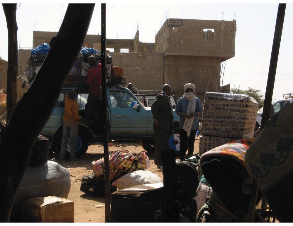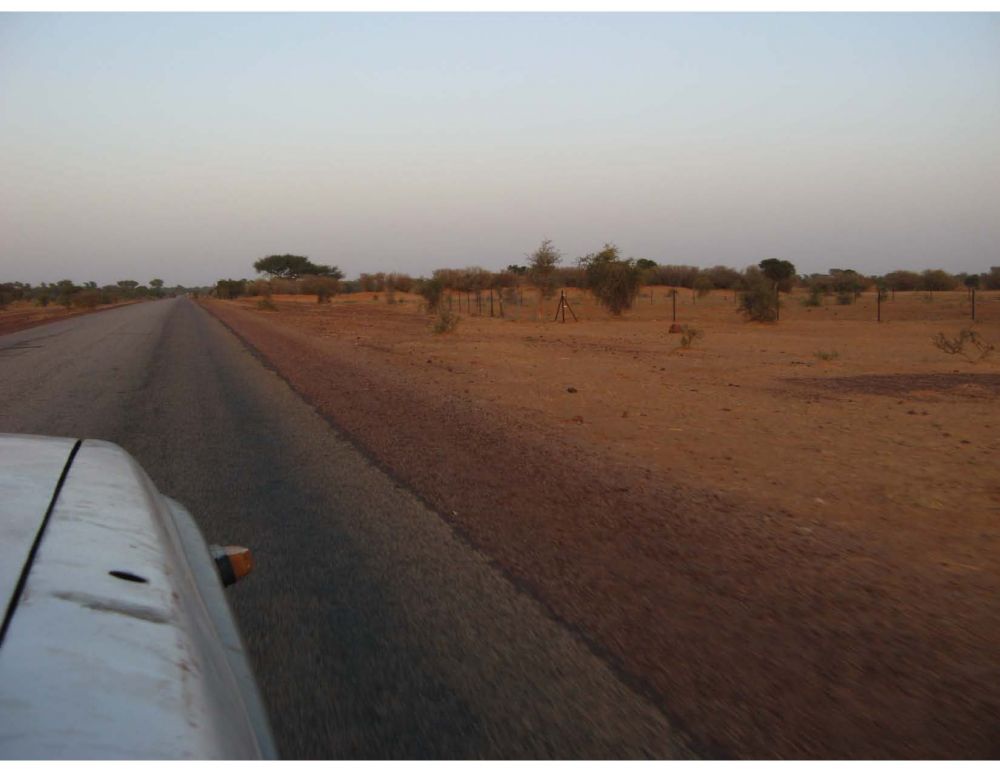 这才发现,所有国内航线禁飞。由于穆斯林武装与世俗政权的战争,维和部队疲于运兵, 侵占了每一个国内机场。从此开始了马里行路难的恶梦:该国主干道上,不是坑坑洼洼,就是一路泥泞,速度堪比自行车。站内磨蹭了几个小时的大巴,完全不按时 刻表出行。每到一村镇必然停车许久,届时路边村民无论男女老少蜂拥而上。个个使出浑身解数,高声叫卖各种土产及零食(6)。根据同车唯二的外国乘客,来自 比利时的某先生所猜,许多村民仅以此为生。但见一路下来,车厢内瓜皮果壳满地,几乎无从下脚。 如此走走停停地过了近15个小时,远超预定的9小时,然而六百多公里车程还剩一百多。午夜已过,拥挤的车内令人憋屈。到达杰宁岔路口时(Djenne Carrefour),隐约可见一辆四驱停在路边。笔者当即决定,提前下车碰碰运气。