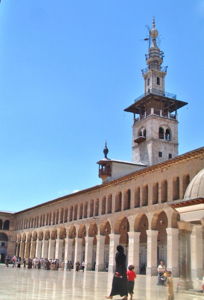 去参拜清真寺的信徒可以从正门 (东门)自由进出。游客需要从另一个门买票进入。 正好赶上朝拜的时间,我跟着人流走,不知不觉地就从东门进到了清真寺的庭院。倭马亚清真寺占地3.3万多平方米。那块地方最早的主人是公元前三千年的古庙 和神像。后来罗马人在这块地方建起了基督教堂。公元379年改建为圣约翰洗礼大教堂。公元636年阿拉伯人破城,罗马人只得叶落归根。从公元708年开始,用了大约七年的时间在原圣约翰教堂地基上建起了倭马亚清真寺。