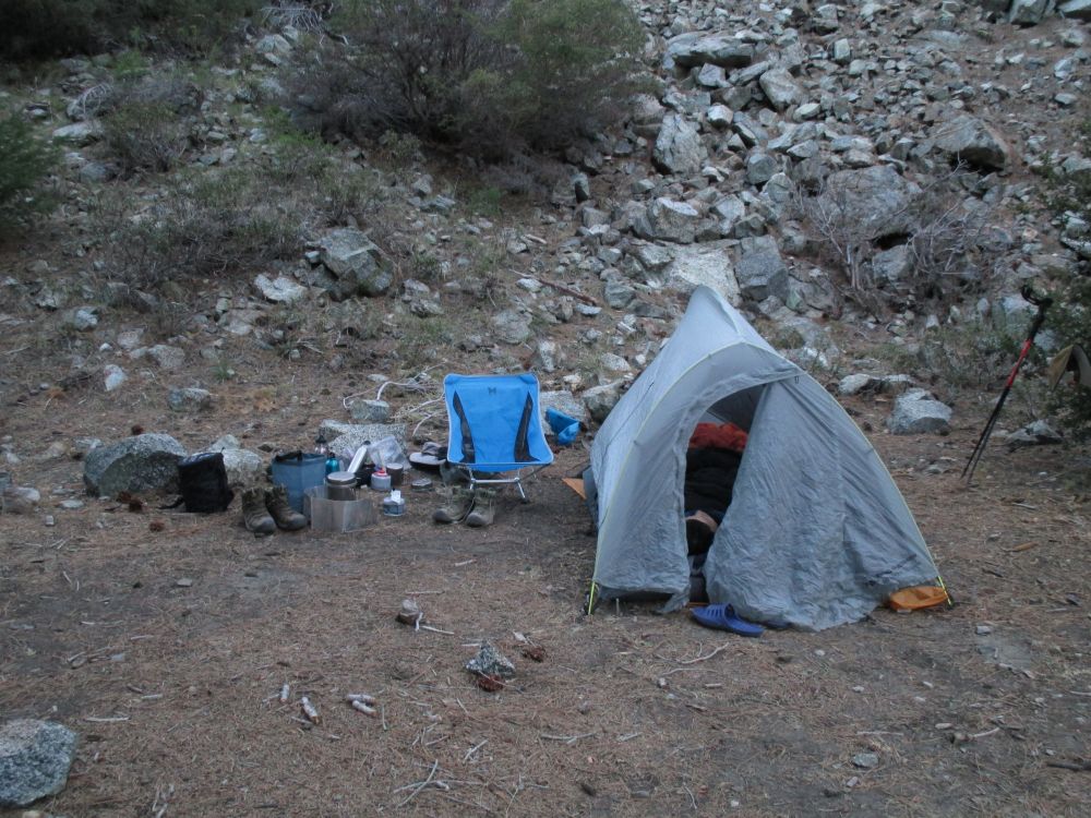 一到营地,大家没顾的喘一口气,马上都非常自觉地开始搭帐篷构建自己今晚的新家。我刚买回帐篷时试过一次搭帐篷,现在毕竟是老大妈了,记性差了,竟然忘了,不过在领导面前还是要故作镇定,不能让领导有丝毫惶恐不安,我假装老手似的看来一下就明白怎么安装。很快在领导大而有力的大手帮助下,帐篷支起来了,露营椅子也支起来了。不敢劳动领导,其他的活就由我独自操办了。邻居队友很不以为然,认为我家领导袖手旁观,象个公子哥儿。我赶快解释;领导痛恨露营,被我拖来已很给面子了,我要好好讨好他,照顾他肥吃肥喝,轻轻松松,快快乐乐,这样下次就还能陪我远途背包露营。他们理解性的一笑了之。今天我成了领导的奴婢,不过是心甘情愿,感恩戴德,快乐无比的奴婢。