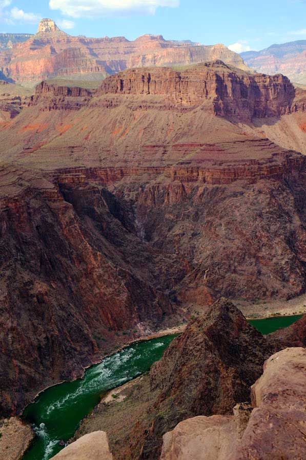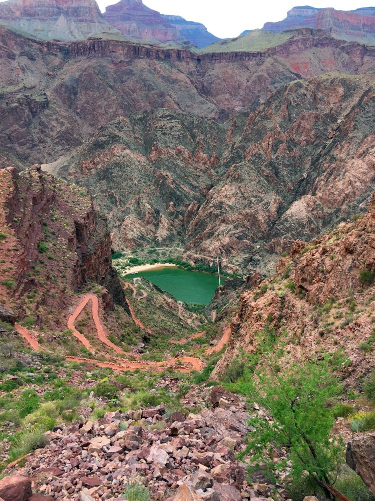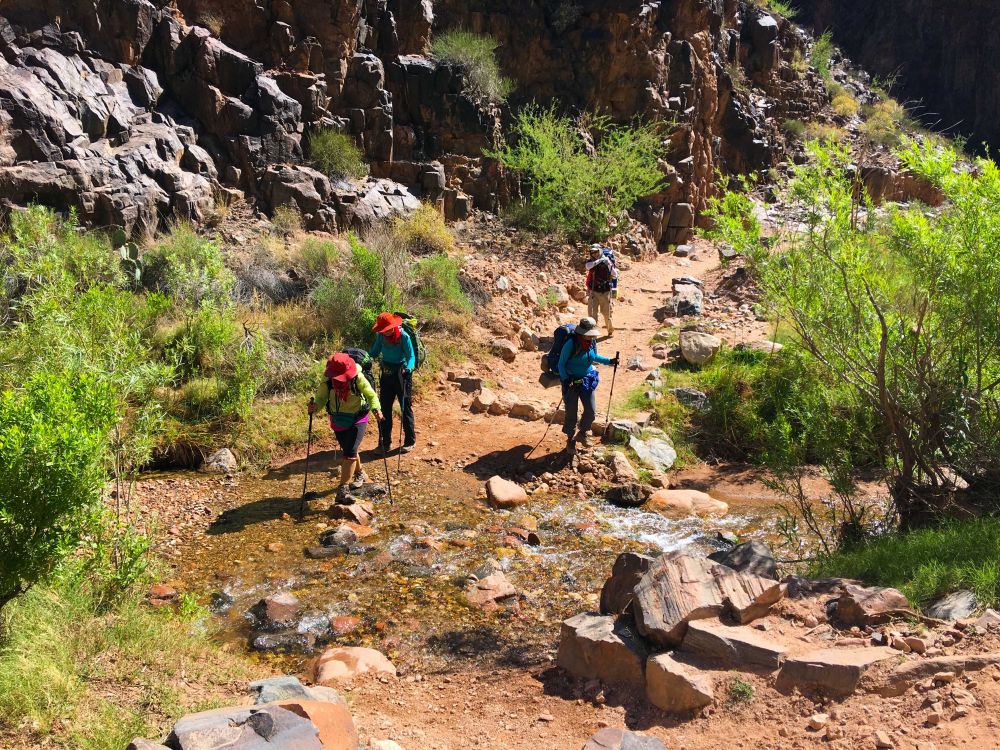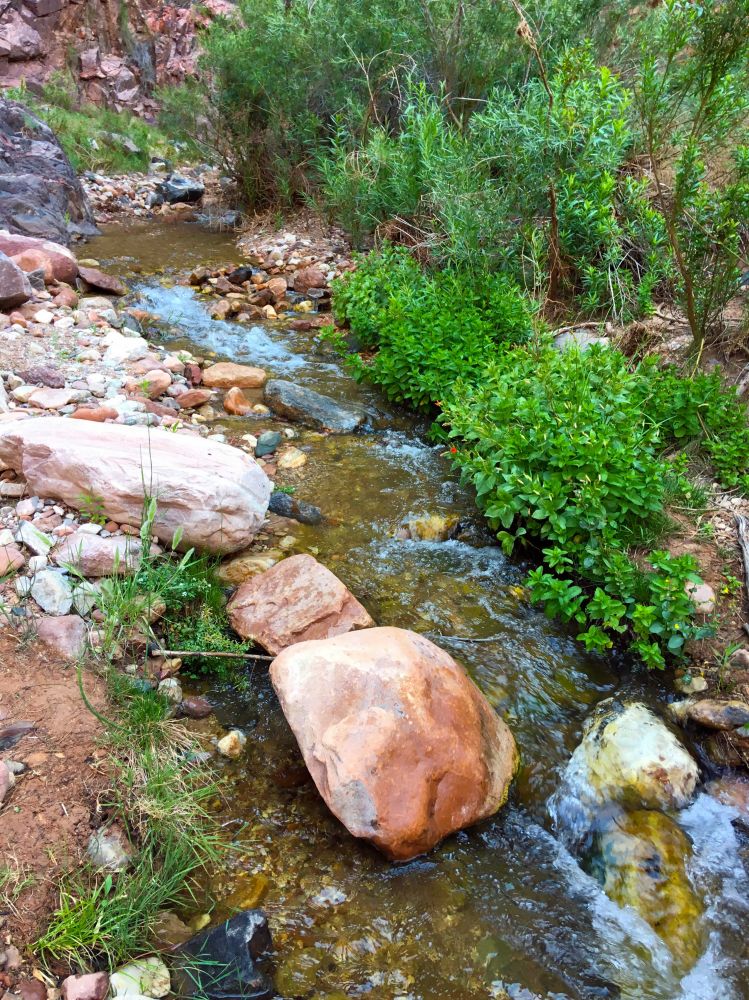 整理妥当,我们又开始继续往上走了。今天是最轻松的一天,所以我们悠闲的慢慢走, 一边欣赏美丽的景色,一边聊天开玩笑,溜溜达达顺着步道走着。 如果说第一天是恢弘壮观的景色, 那么今天就是娟秀细腻的世外桃源。我们刚开始一直是伴着科罗拉多河岸,一边观赏碧绿的河水穿过两岸红色山体,一边看着河上漂过的漂流船。很快就拐进一条流入科罗拉多河的小溪,然后又顺着弯弯曲曲的小溪慢慢往上走。路上几次要涉过溪水,好在大家都是防水靴子,过溪水是一种快乐的体验。
