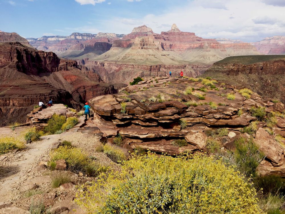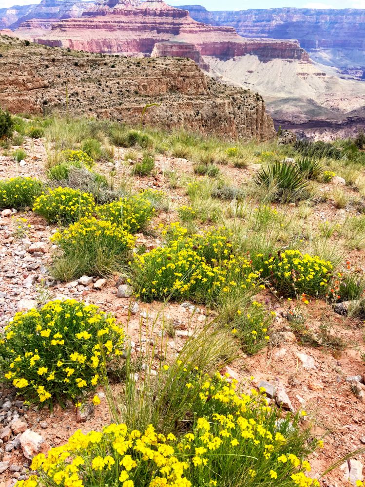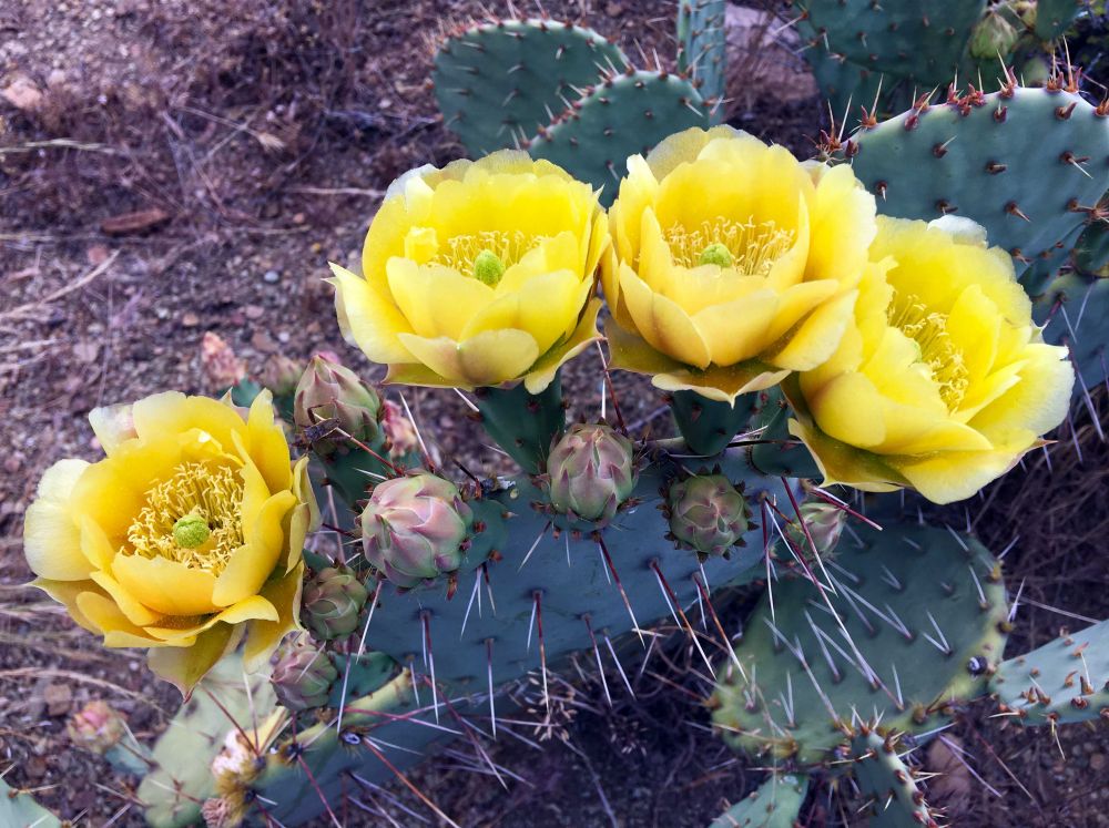 我们一行人慢悠悠的朝着plateau步道走去,这条路只有1.5 迈,很好走,平坦还有细沙。路边有着很多盛开的黄色野花,发现好几种野花,还看到巨型仙人掌,每个都很大,大约有三个大个人头叠加起来那么大。