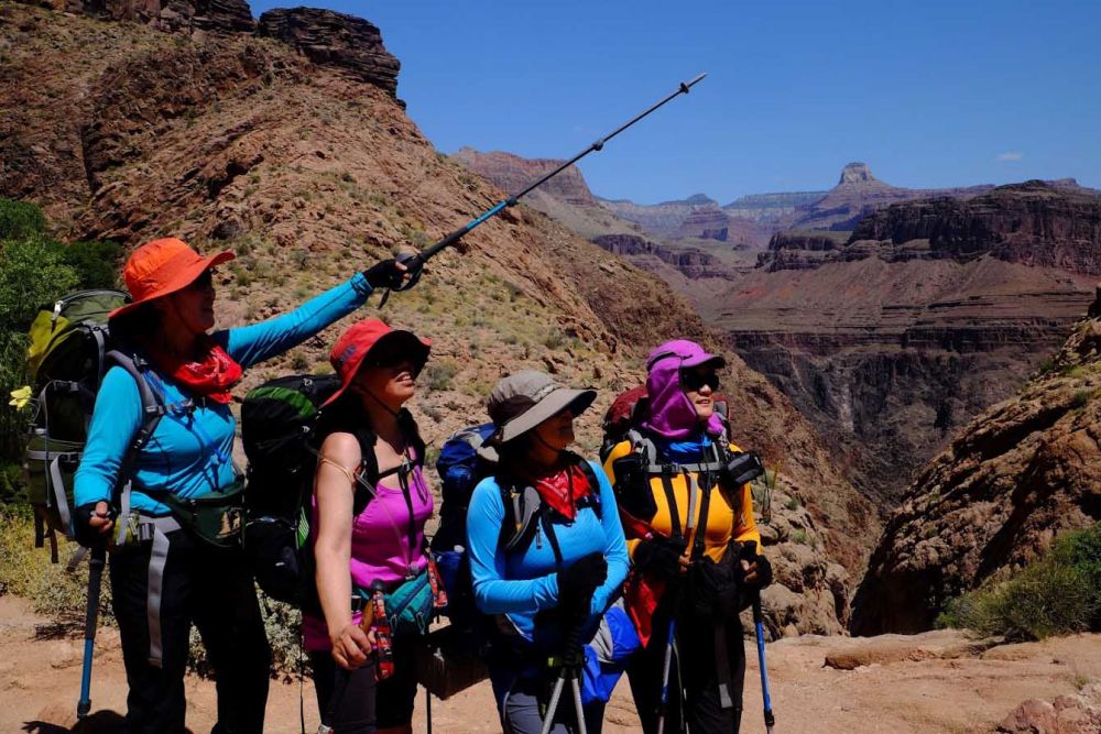我们四个美女都穿着不同颜色而且艳丽的衣服。路上迎面碰到从大峡谷上缘下来不少的hikers,有人说我们几个人穿的各色衣服很漂亮。有一位男士干脆把我们叫着Rainbow Hiker(彩虹徒步者),看看花枝招展的我们多么漂亮!