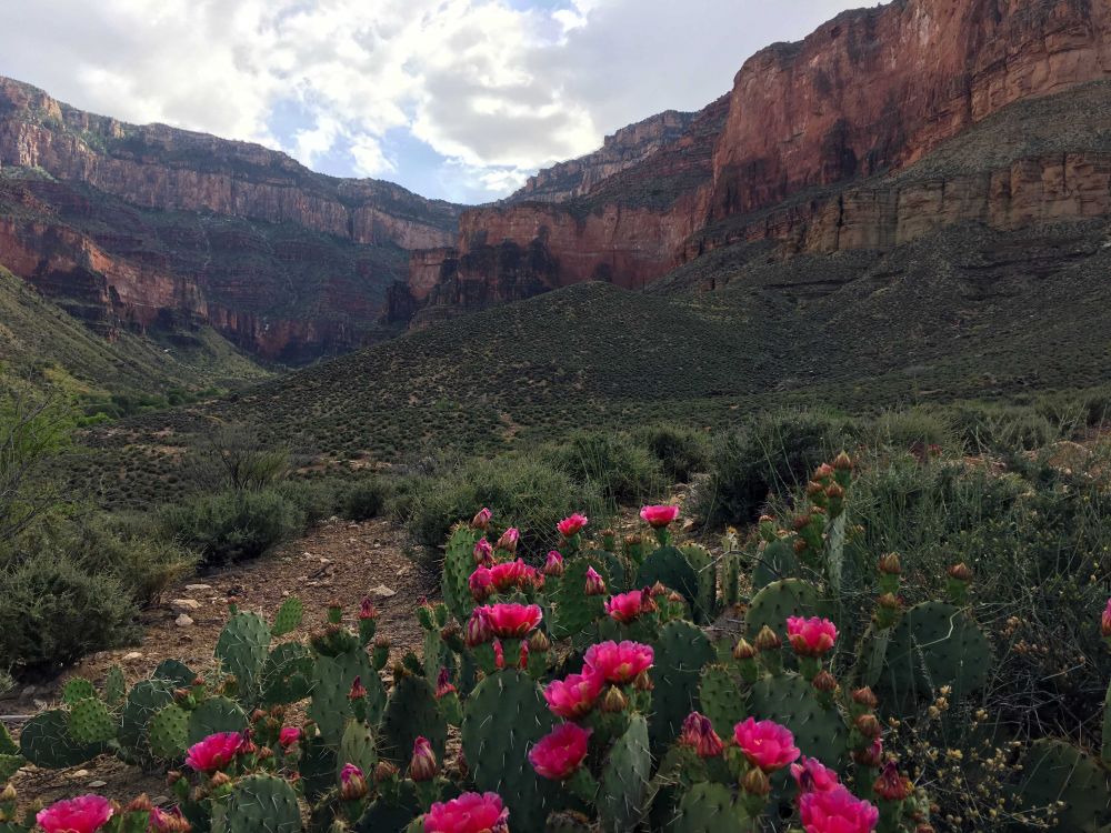 一路看到各种以前没见过的野花,不停的为它们美丽的芳容拍照,顺便休息。有橙色的小花,有可爱的daisy,有不知名的各种野花,但最令人吃惊的是在红色的峡谷干旱的土地上盛开着浓艳无比的仙人掌花。那艳丽的hot pink颜色是那么抢眼,妖艳,几乎每一个路过的人都忍不住拍下那美丽的花朵。
