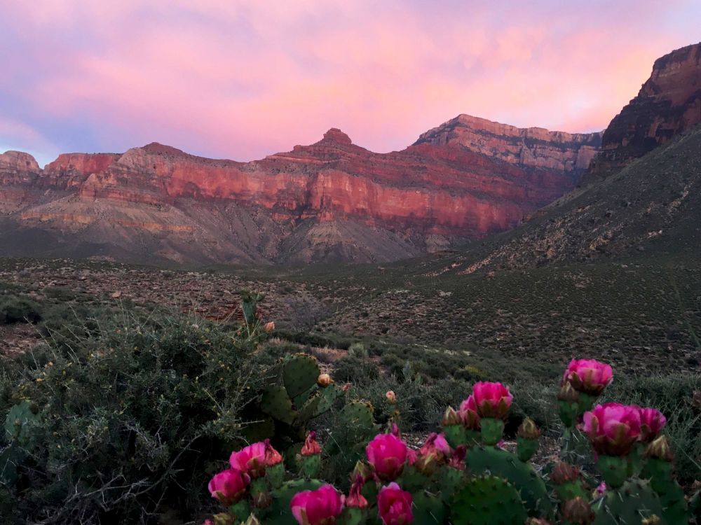 帐篷搭好后,我们又去附近探险掠奇。大峡谷一共有四种颜色的仙人掌花,一种是Hot Pink, 一种是红色, 一种是粉色,还有就是黄色。