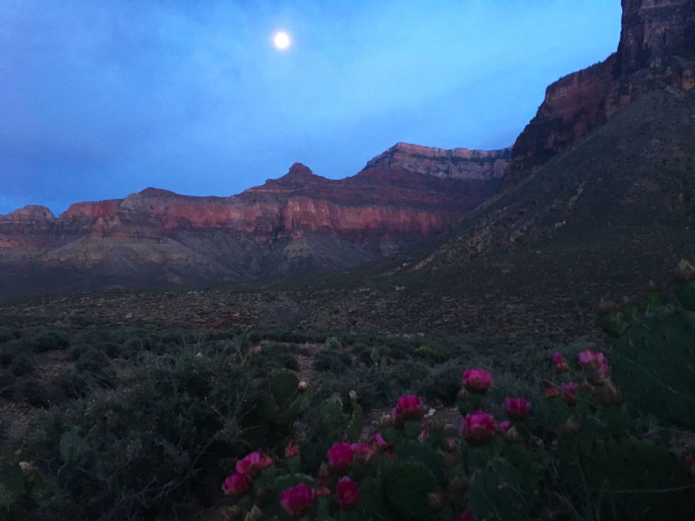 大姐和Nelson赶着爬上高处去看夕阳,Jenny和温姐 就近看晚霞,我突然想起那丛盛开的红色仙人掌花,就赶到那里坐在花下等待夕阳那一抹红晕披挂壮丽的山峦。我拍到了绝美的大峡谷夕阳。我相信没有几个人拍到这美丽的时刻,而我却幸运的捕抓到了这最美丽的时刻。