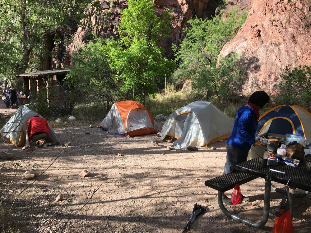 Indian garden营地就那么几个,难怪不好预订到,每个营地都有一个棚子,我们挑了个营地,又搭起帐篷,两位大姐的帐篷又是第一个搭好,她们又来帮我们,温姐又是把钉子钉的又稳又好,不像我钉的离了歪斜的。