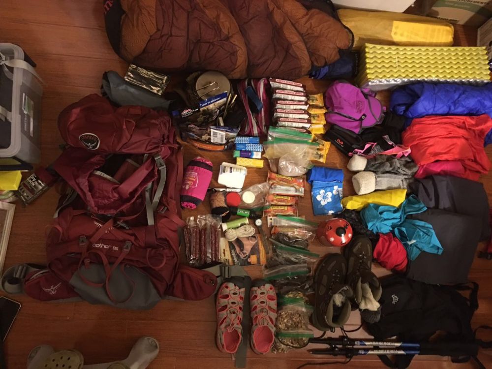 我是一个从来不亏待自己嘴巴肚子的人,即使背包露营也要吃的舒舒服服的人。所以除了按照也猫姐吩咐要买的东西外,我自己买了两大块牛腱肉,一堆萝卜干,豆腐干,将牛腱肉和豆腐干卤煮了几乎6个小时,又炒了萝卜豆腐干,烙了一大摞葱油饼,煮了几个鸡蛋,又带了煮粥用的玉米碴子和麦片。再加上两包户外脱水食品,十包方便面,几包牛肉干,几包混合坚果,还有N多的能量棒和十多包榨菜丝等等。也猫大姐严格规定背包重量不能超过30磅,还被告知出发前还会秤一下每个人的背包。可我出发前打包一称竟然38磅,不管三七二十一,打包已经累得出了一身臭汗,不想再开包了,爱咋咋地吧!