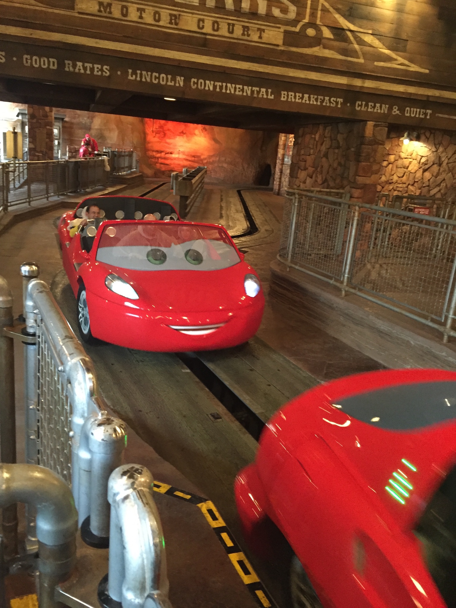 同样网上买票,disney分两个园区,theme park & adventure park。如果是两天可以两个园区都玩,但如果是一天,当然选adventure park。在disney,可以取fast pass,也就是说你拿你的票可以取某一个项目的fast pass,然后在规定的时间内就可以不怎么排队就玩了,但是一个项目的fast pass取完之后,过一两个小时才能取下一张fast pass。我们是一进门就取了radiator springs racers 的fast pass,然后就去玩过山车啦,自从坐了 国内方特的过山车后,这个过山车就是浮云