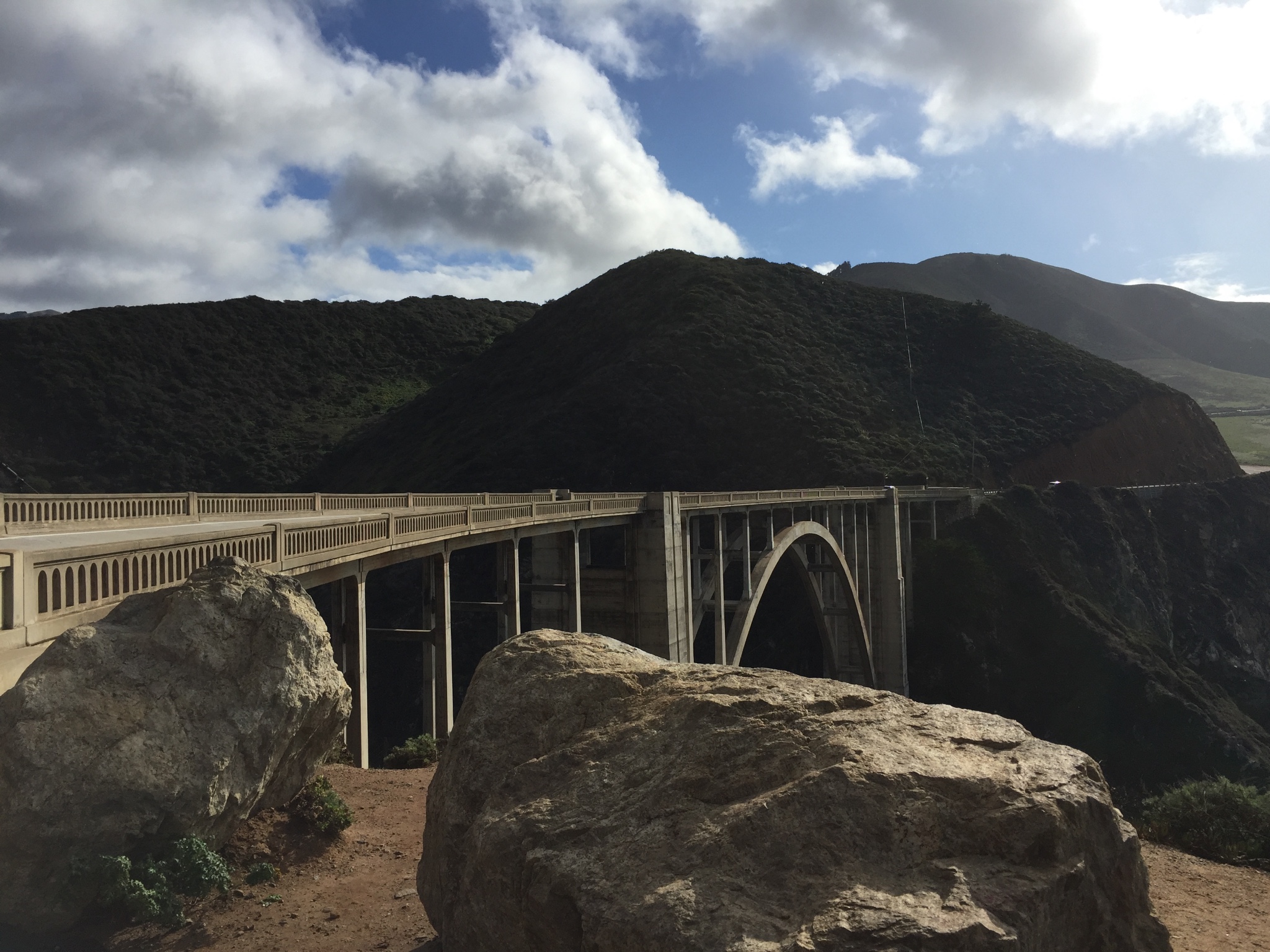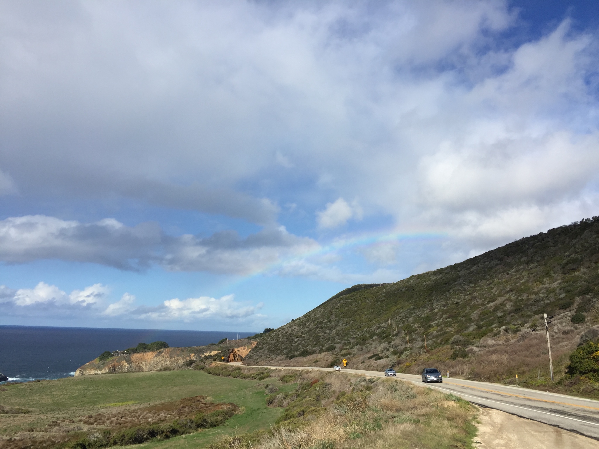 由于一号公路据说不太好开,因为一面是山一面是海,一个人开会很累,所以如果想行驶完一号公路首先驾驶技术要靠谱,其次最好有两个人换着开车,再者中途最好找个地方休息一晚。我们没有开完一号公路,仅仅开到了bixby creek bridge,就是那个十分著名的桥那里。由于手机到那里就没有信号了,借朋友的gps也没空捣鼓,然后我们竟然开过了那个桥,然后就遇到啦彩虹,哈哈,不过违反了交通规则掉了个头拐了回去看bixby creek bridge