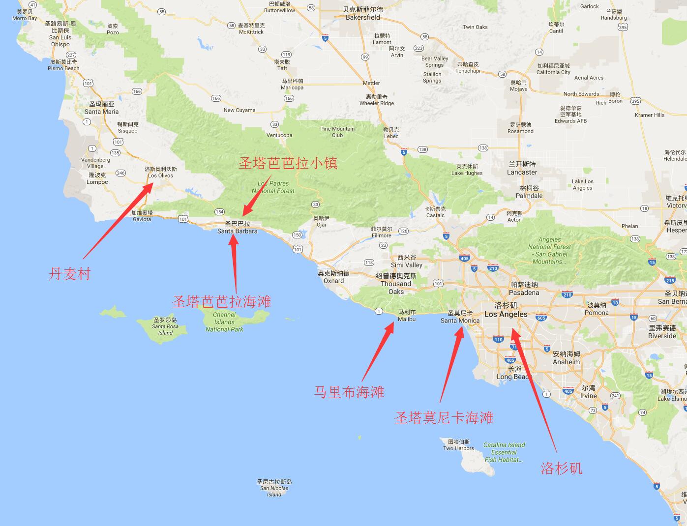此段亮点:丹麦村、圣塔芭芭拉、马里布海滩、圣塔莫尼卡