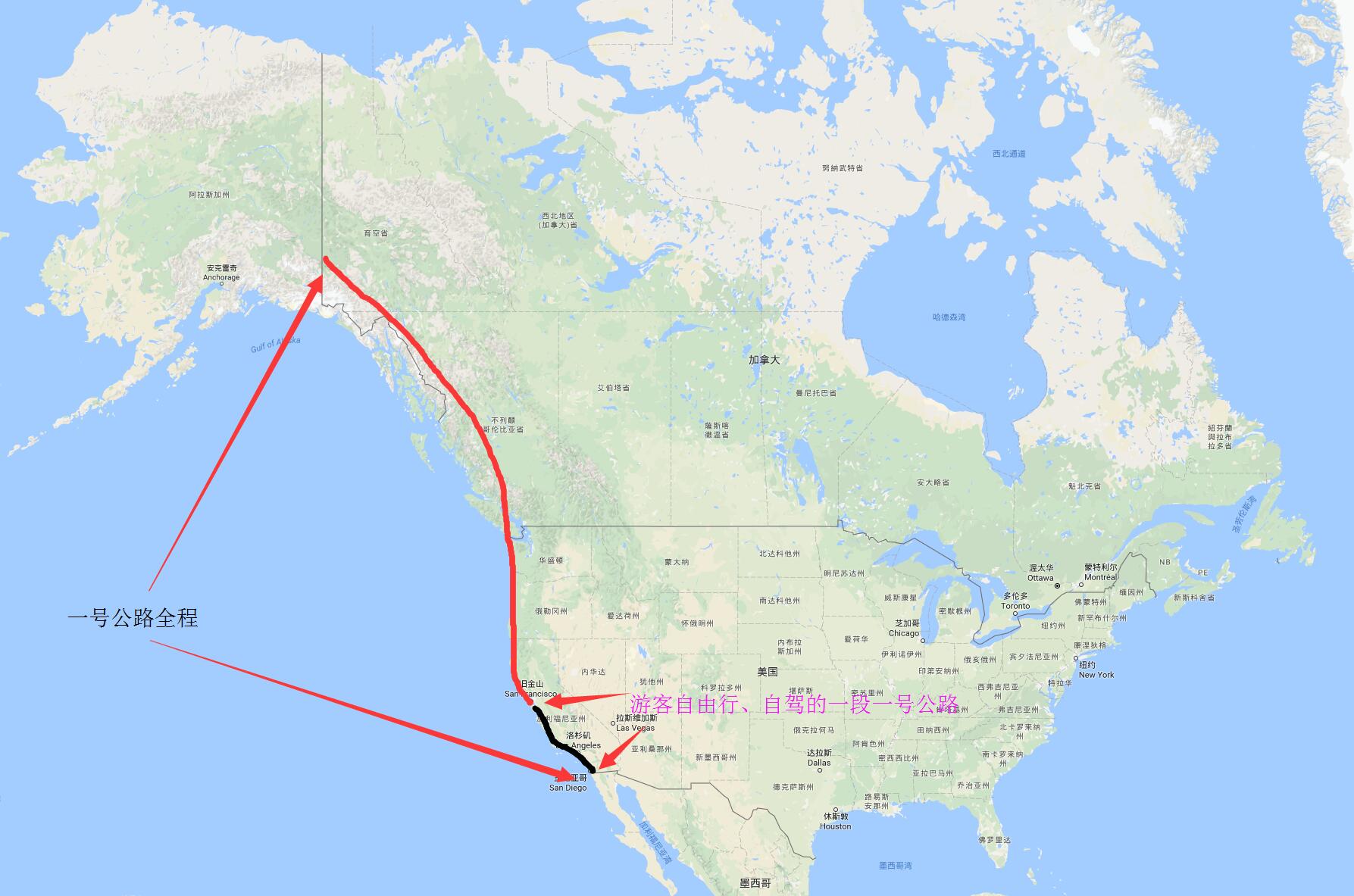 一号公路其实是很长的一个公路,从阿拉斯加一直到墨西哥(见上图)。大家口中所说的一号公路其实是其中的一部分,也就是从蒙特雷开始到洛杉矶的这一段的一号公路(见下图)。这段道路绝对值得一玩。