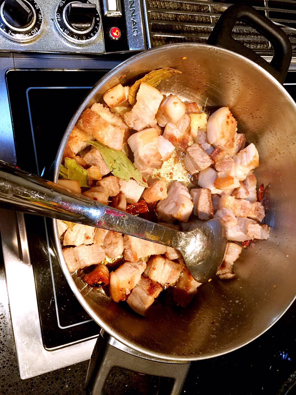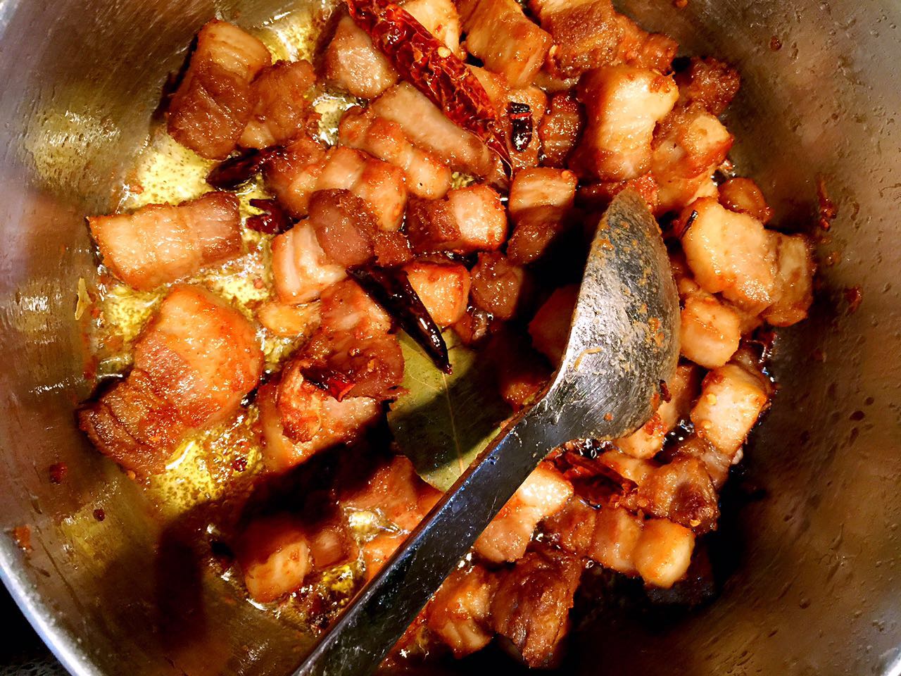 3。起油鍋,加入小半碗白糖,(Rock candy)熬至粘稠,呈淺褐色,加入灕乾水的肉塊兒,翻炒至上色,(Brown color)全部上色後加入少量水,沒過肉即可。
