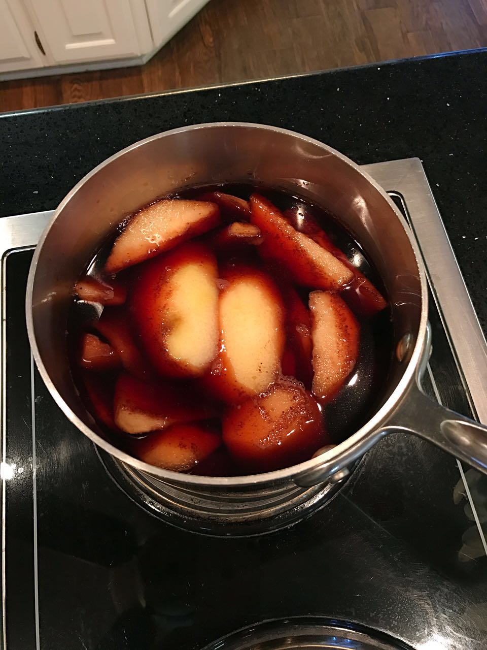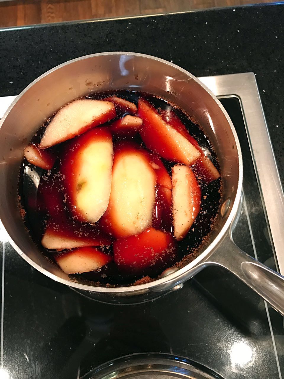做法:小火慢燉,不能燒開酒.熄火,讓梨在酒和香料裏浸潤幾個小時,等喝前加熱,如黃酒.